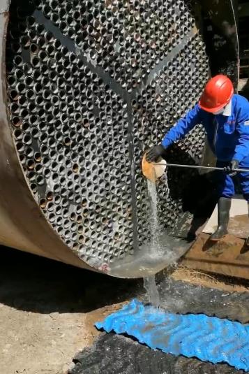 首先將熱交換器的封頭、封尾拆掉,露出所有的列管,然后用剛性噴槍或撓性高壓噴槍插入管孔200-300mm的距離,打開噴槍控制閥,使高壓水加壓,一直到達額定壓力,隨后,在清洗過程中,逐步使噴槍向管道深部推進,直到高壓水射流從熱交換器另外一端噴出。之后,操作人員將噴槍在工作狀態下緩慢抽回,垢物則繼續被破碎,直到將噴槍拉回到送進時的管口處,這時垢物也陸續被排出管道。此后,采用同樣的方法,對逐根列管進行清洗,直至將整臺換熱器的管程清洗干凈。