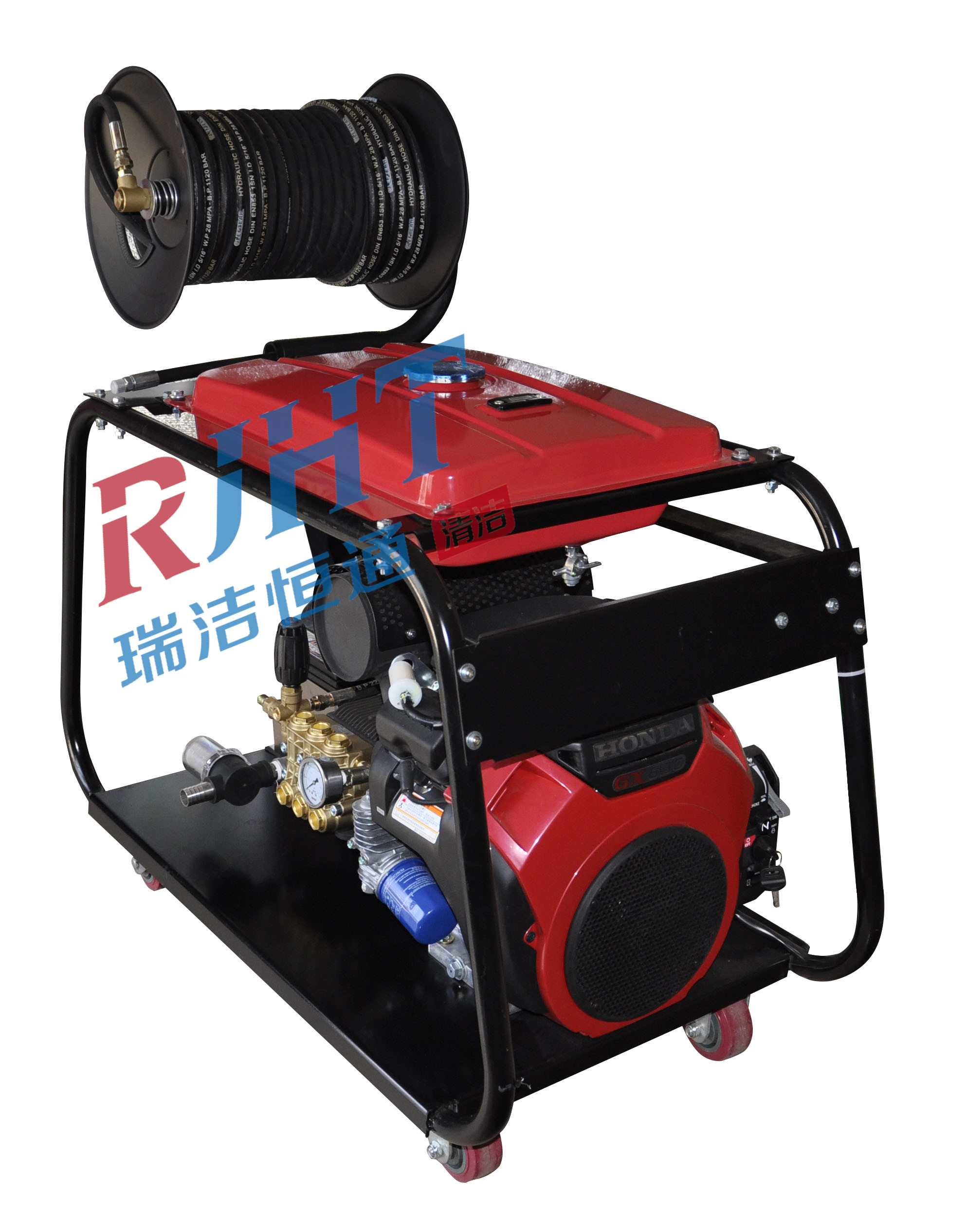 瑞潔恒通生產的高壓大公司疏通機由發動機通過聯軸器帶動高壓泵工作,常溫清水由進水管進入高壓泵,在噴嘴或噴頭處形成高壓水射流,通過高速射流對管道內污垢層的沖擊、剝層、破碎等破壞作用,達到清洗內管壁的作用。通過調節高壓水流的不同壓力,以達到清洗不同結垢物的目的,疏通清洗效果達到95%以上。