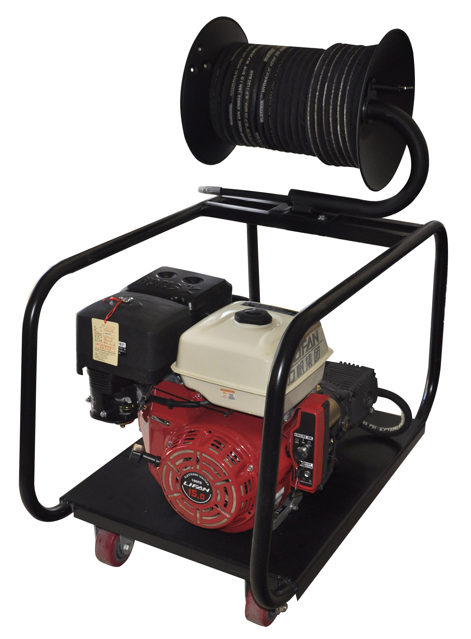 高壓管道疏通機具有巨大的能量噴射出的高壓水射流完全能夠破壞堅硬結垢物和堵塞物,但對金屬卻沒有任何破壞作用。同時又由于高壓水的壓力小于金屬或鋼筋混凝土的抗壓強度,故對清洗對象沒有任何破壞作用。應用于疏通、清除管道中的堵淤和污物。它以汽油機、柴油機或電機為動力驅動高壓泵運轉,利用高壓水射流在噴頭上產生的推進力自動前行。當噴頭到達管端時,高壓水后作用力清掃管壁并將雜物沖出管外,以達到清洗管道的目的。
